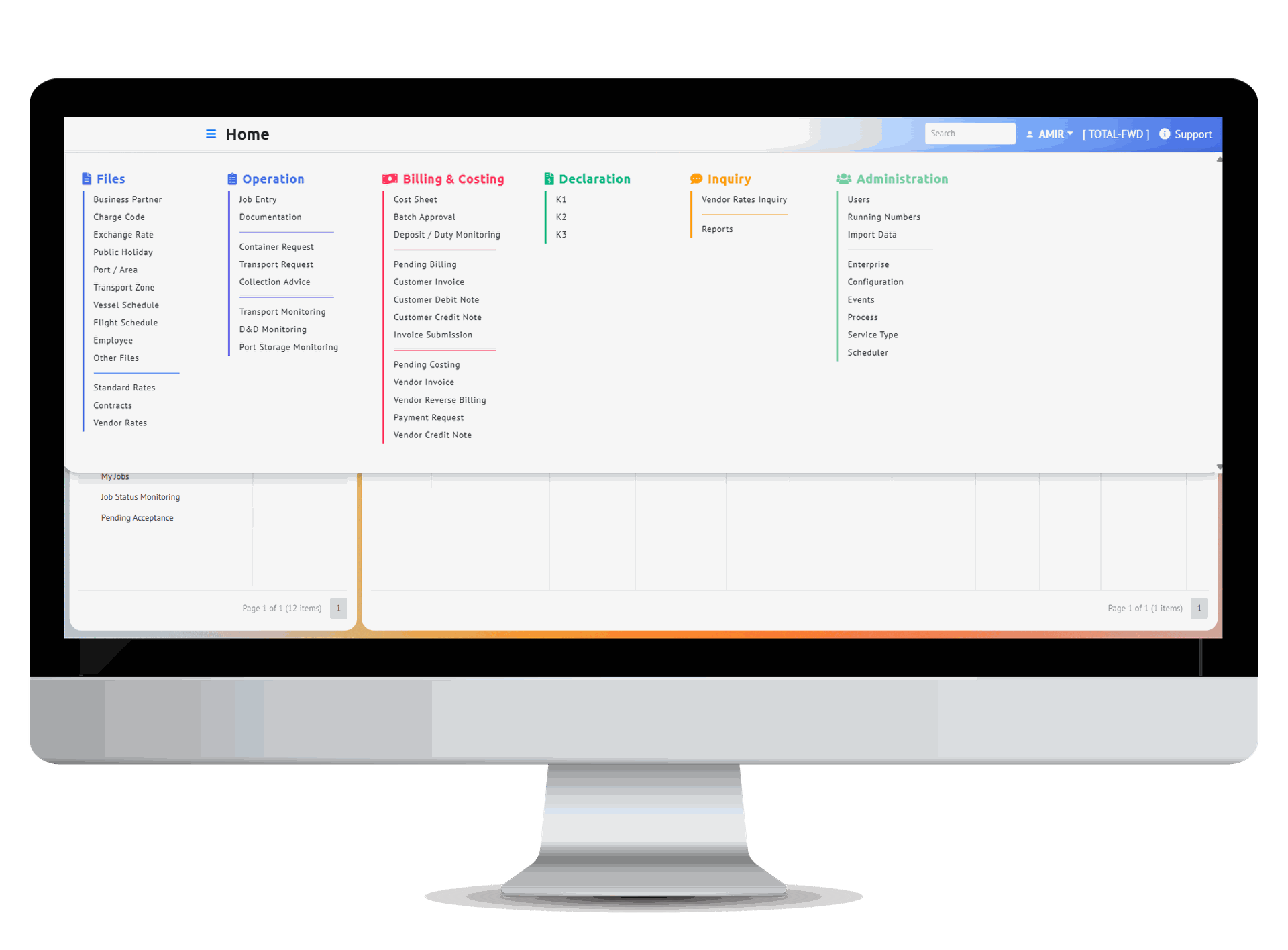 Job Management includes Order Management, Job Entry, Documentation, Container Request, Transport Request, Port Storage Monitoring, Declaration, Collection Advice, and Proof of Delivery (PoD).